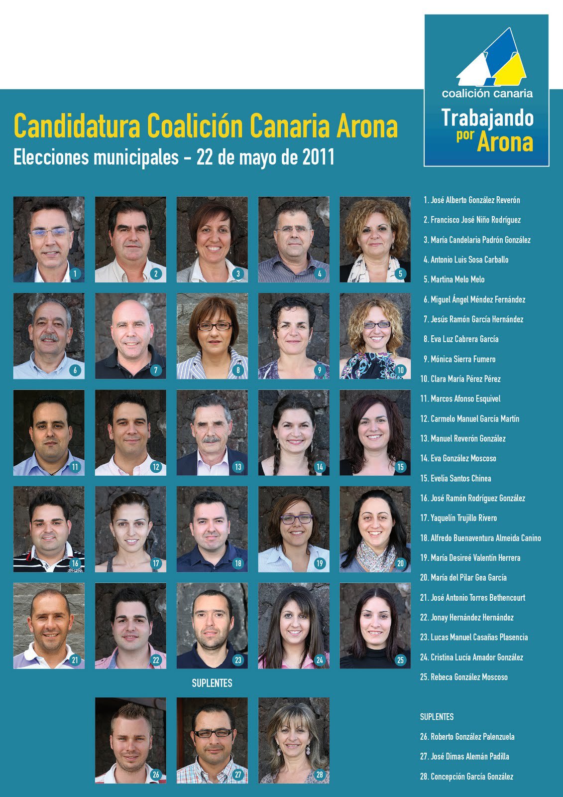 Francamente, esta lista es igual o peor que la presentada en la anterior legistatura. Cansados estamos ya de utilizar a no cualificados para rellenar huecos, de dejar a personas que han traicionado al partido para no levantar sospechas de que en las filas de CC de Arona hay más de una desavenencia, de quitar a concejales ineptos y no afrontar públicamente que se ha hecho porque el clamor del sector turístico no ha podido ser acallado y, por si ésto fuera poco, se ha vendido la estratagema de cara al público como una promoción del individio Herrera al gobierno Canario o Turismo de Tenerife. El único que merece el traslado a las lista de CC de Melchior es sin duda Antonio Marichal, concejal trabajador donde los haya. Esta lista decepciona por improvisada y desde luego como ciudadano de Arona, mi voto no se compra.