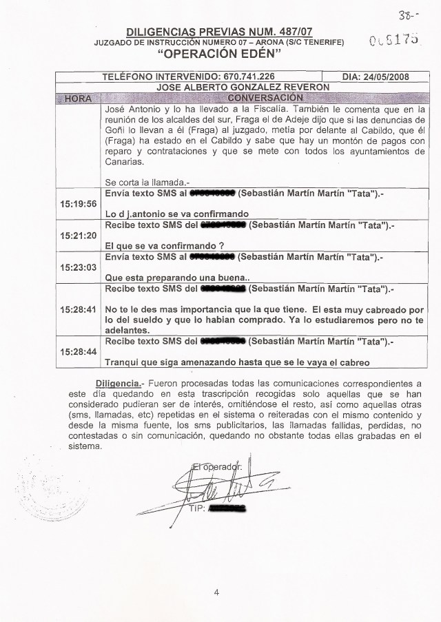 Resumen policial de las escuchas telefónicas al alcalde de Arona relativas al plan fallido de comprar a José Antonio Reverón