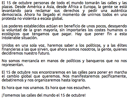 El 15 de octubre será una de las fechas de obligada referencia en cualquier análisis histórico de esta época. Seamos muchos (que lo seremos) o pocos (que lo dudo), nos hagan caso o no (y nos lo acabarán haciendo), vamos a gritar desde calles y rincones de todo el planeta un ¡basta ya de tanto mamoneo político-empresarial-financiero, basta ya de que unos pocos nos chupen la vida, la felicidad, los derechos, los recursos, el trabajo y el dinero a la inmensa mayoría, joer!