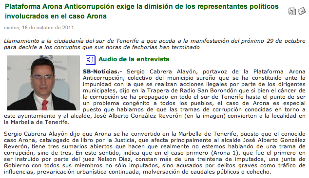 El Comité Local de Alternativa Nacionalista Canaria (ANC) en Arona rechaza las presiones que vienen sufriendo sus representantes desde la salida a la luz pública de su boletín anticorrupción. En dicha publicación, los vecinos de Arona denuncian los casos relacionados con la corrupción política de esta zona de Tenerife. Esta organización considera de extrema gravedad que los gobernantes imputados en múltiples casos de este tipo traten ahora de cercenar el derecho a la información de todos los ciudadanos.