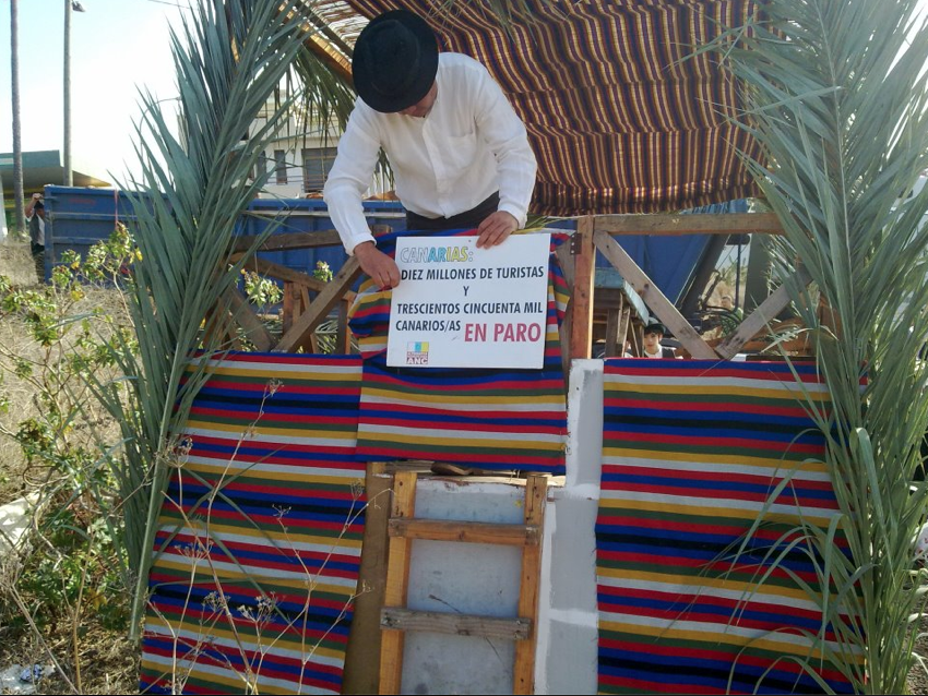 El pasado mes de enero, por ejemplo, fue prohibida la participación de su carroza en la Romería en honor a San Antonio Abad del casco del municipio ¡¡porque se negaron a retirar de la misma un cartelito en el que se podía leer: «Canarias: Diez millones de turistas y trescientos cincuenta mil canarios/as EN PARO», y que llevaba como firma las siglas del partido y una banderita canaria con las siete estrellas verdes. Creo recordar que la prohibición fue secundada por la comisión de fiestas, por miembros del gobierno aronero de CC y por la Policía Local.