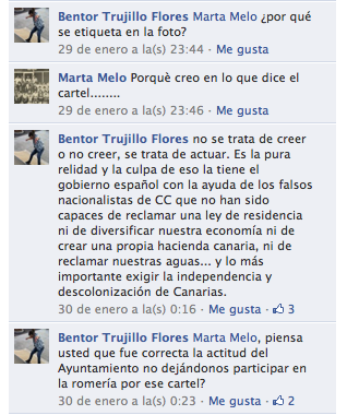 Jajaja, el colmo del partido independentista fue que la concejal aronera Marta Melo (CC) se etiquetó en esa foto porque, según ella, comparte el mensaje del cartel que, sin embargo, decidieron censurar en la romería sus compis de gobierno. Surrealista, xd, jajaj. Les reproduzco la indignación que expresó Bentor Trujillo (a quien le toca protagonizar todos los embistes censores contra ANC y sus luchas) al descubrir que esa edil del gobierno estaba etiquetada en la foto publicada bajo el epígrafe «este es el cartel por el que no nos dejaron salir en la romería de Arona» y la respuesta que le dio la edila. Bentor intentó sin éxito abrir debate con ella: