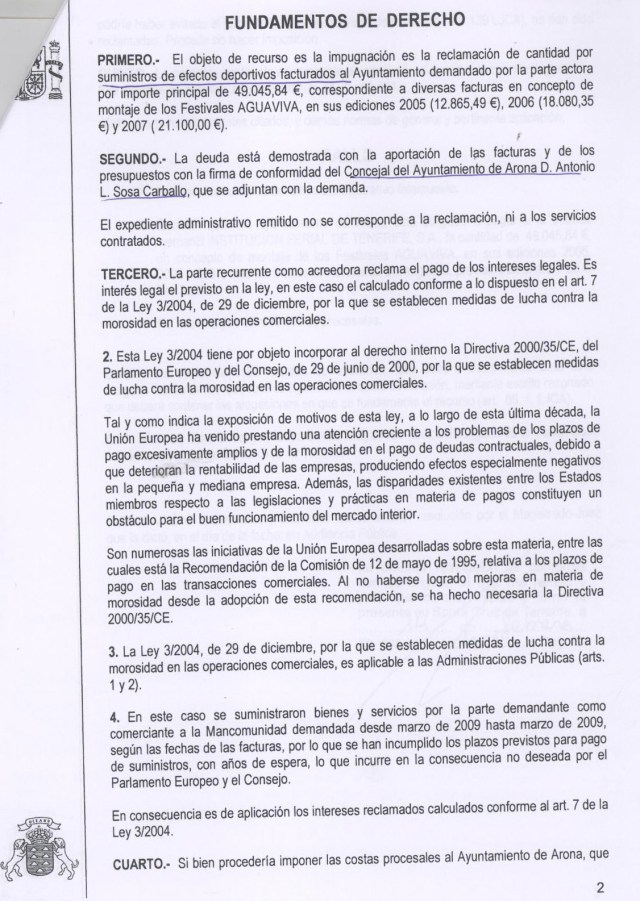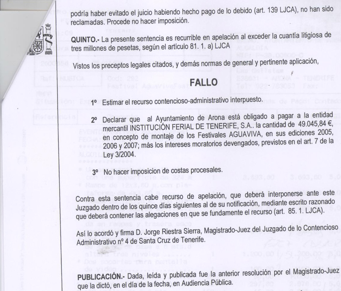 Ya resulta escandaloso de por sí que el Ayuntamiento de Arona tenga que pagar ahora, a mediados de 2012, una deuda festiva de 2005, 2006 y 2007 valorada en 49.045,84 euros por unos encarguitos que el gobierno de CC reconoce que hizo, pero no le salió del moño pagar. Ese despendole de CC en plan ‘sí, nosotros reconocemos que hicimos el encargo y que la empresa (Instituto Ferial Tenerife S.A.) prestó el servicio de montaje de escenario e iluminación que habíamos solicitado, pero pagamos solo si alguna sentencia nos obliga», se ha saldado con un castigo de más de 20.000 euros para las arcas públicas, con lo que veeenga, plus de escándalo. Y estamos de suerte, porque como aclara el titular del juzgado de lo contencioso administrativo número 4 de Santa Cruz de Tenerife, a los demandantes se les olvidó reclamar las costas.