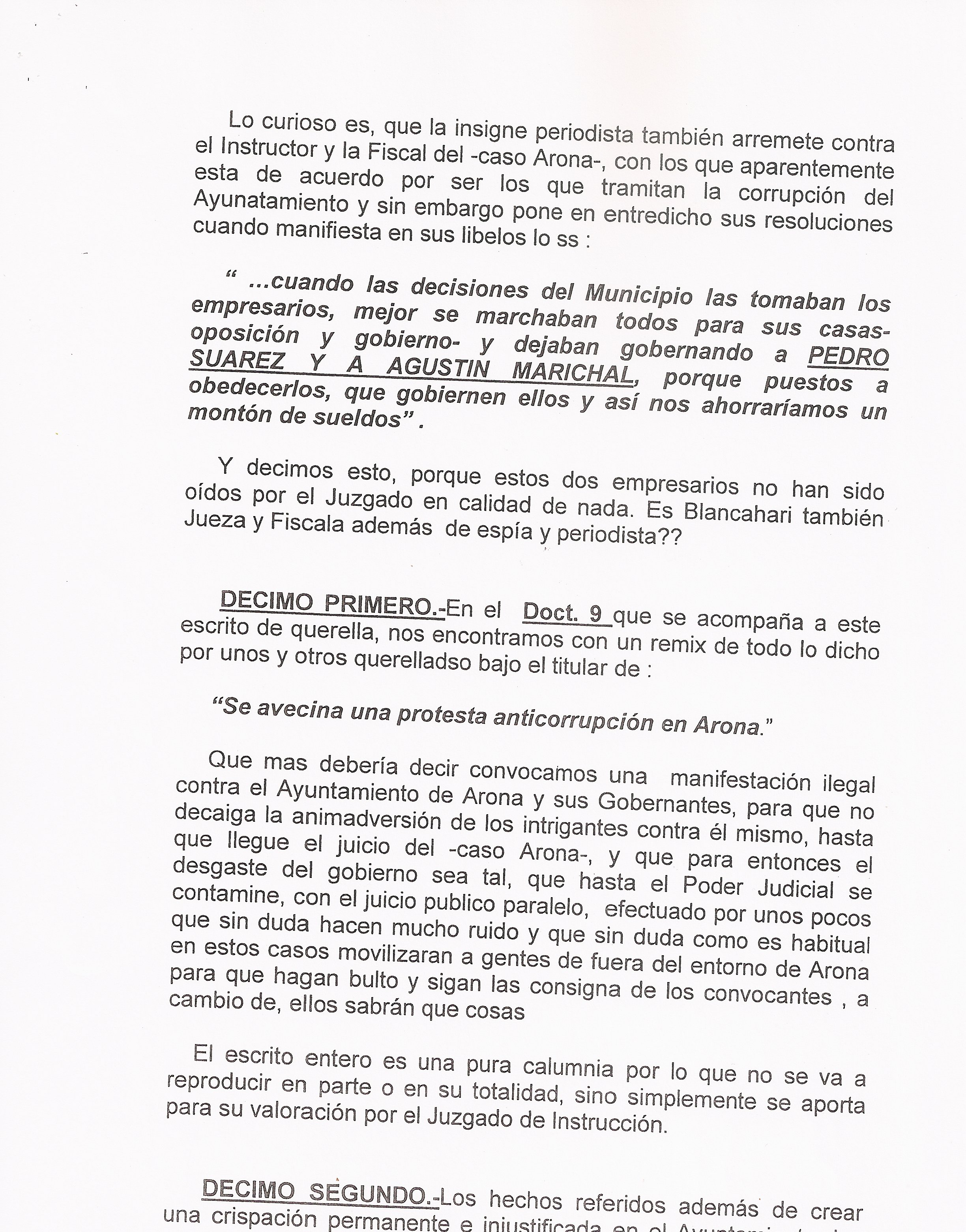 A ver qué más dijo (que es que aún no tengo el documento, solo lo leí una vez)… Ah sí, que casi todo el blog BlancaHari versa sobre el Caso Arona. Y a continuación, agárrense, reconoce que está imputado en esa causa. ¿Y entonces?, jajaja. De milagro lo admitió, yo empezaba a creer que ni eso lo tiene claro, aunque solo en el Caso Arona 1 el juez instructor le atribuye delitos indiciariamente acreditados de tráfico de influencias, prevaricación urbanística y prevaricación ordinaria. ¿Creerá que tiene derecho a que no se hable de sus imputaciones y de las pruebas judiciales que las sustentan?