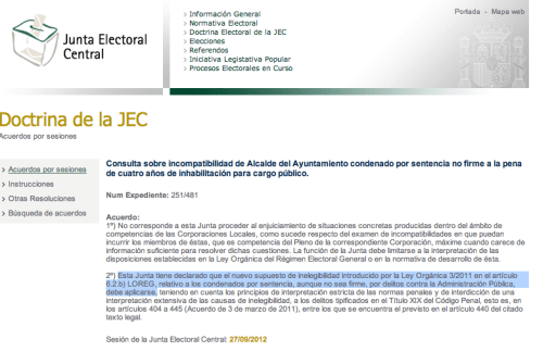 Lo novedoso de tal pronunciamiento es que es el primero que emite sobre alcaldes y concejales inhabilitados por delitos contra la Administración Pública y en un juzgado de lo penal.