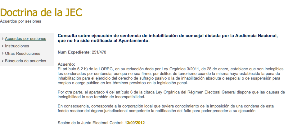 Les posteo el acuerdo de la JEC sobre concejal incompatible por delitos de terrorismo sentenciados en la Audiencia Nacional porque, llegando a la misma conclusión en la aplicación del mismo articulado que le afecta al primer edil de Arona, está redactada de forma más clara (normal que no se esmeren lo mismo con Bertorrentín que con Doña Batasuna).