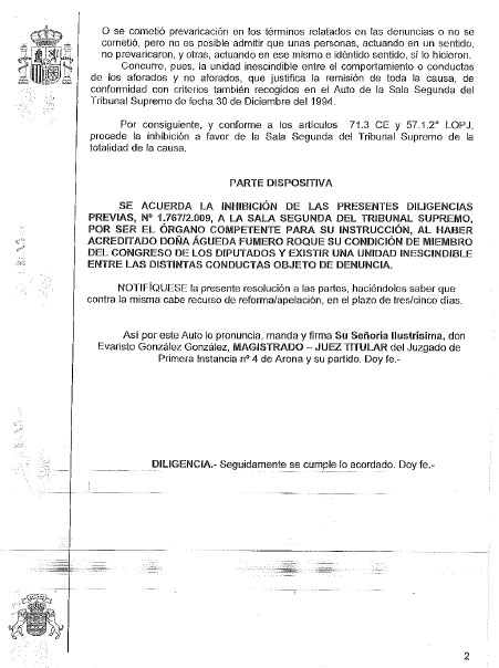 Provindencia juzgado número 4 Arona, Caso Arona 2 al Tribunal Supremo Publicado 27/12/2012 en 451 × 604 en El instructor del Caso Arona 2 decide inhibirse en favor del Tribunal Supremo ← Anterior . Publica un comentario o deja una referencia: URL de la referencia.