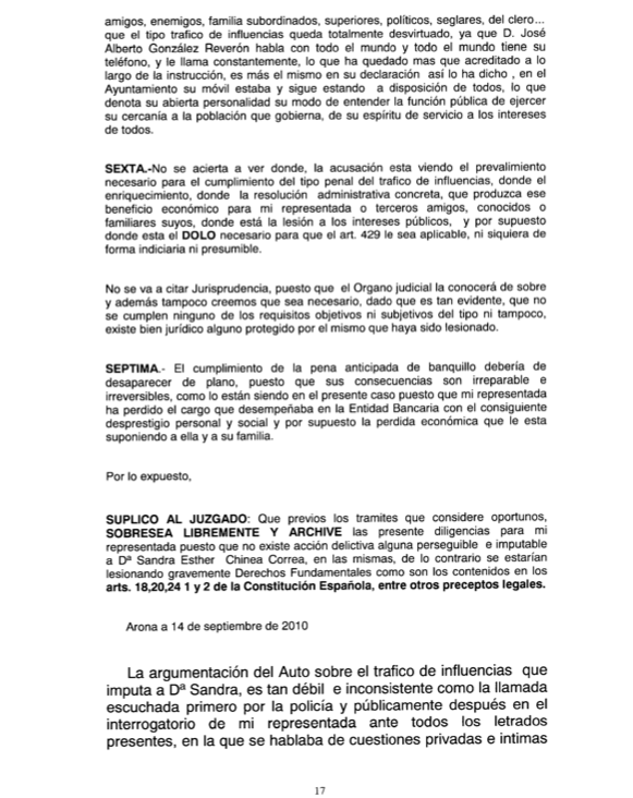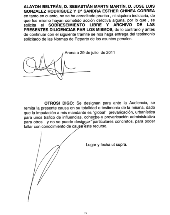 Esta parte del recurso la protagonizan ella y el alegato final de la letrada Olga López Lago pidiendo el sobreseimiento y archivo del Caso Arona 1. La instrucción que plantea mandar a la papelera se saldó en junio de 2011 con 30 imputaciones, la mayoría contra políticos y técnicos municipales, por delitos como cohecho, malversación, tráfico de influencias, prevaricación urbanística…