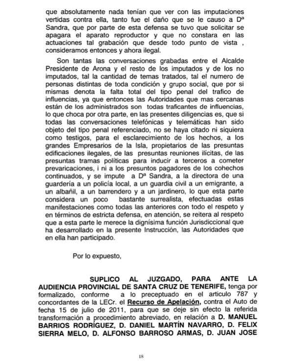 Entre las irregularidades-anomalías que ha planteado a la Audiencia Provincial de Santa Cruz de Tenerife pidiendo el archivo de estas actuaciones, incluye un extenso alegato sobre la injustificadísima saña que juez y fiscal habrían mostrado contra Sandra en el plano íntimo, incluyendo la grabación «ilegal» de conversaciones entre ella y el ex alcalde y su reproducción en público ante una parranda de abogados a pesar «de que nada tenían que ver con las imputaciones vertidas contra ella». Sobre dicha reproducción en sala judicial subraya que «tanto fue el daño que se le causó a Dª Sandra, que por parte de esta defensa se tuvo que solicitar se apagara el aparato reproductor y que no constara en las actuaciones tal grabación que desde todo punto de vista, consideramos entonces y ahora ilegal».