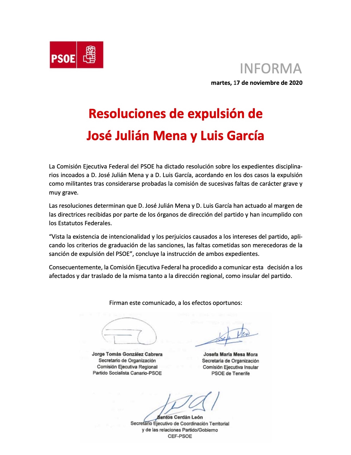 Un abogado del Partido Socialista ha comunicado hoy formalmente al secretario del Ayuntamiento de Arona vía registro municipal (desde el SAC de Los Cristianos) que el todavía alcalde del municipio, José Julián Mena, ha sido expulsado del partido y que, por tanto, pasa a ser no adscrito. Queda por ver si logra mantener el sueldo de alcalde o si hasta eso se le va de las manos.