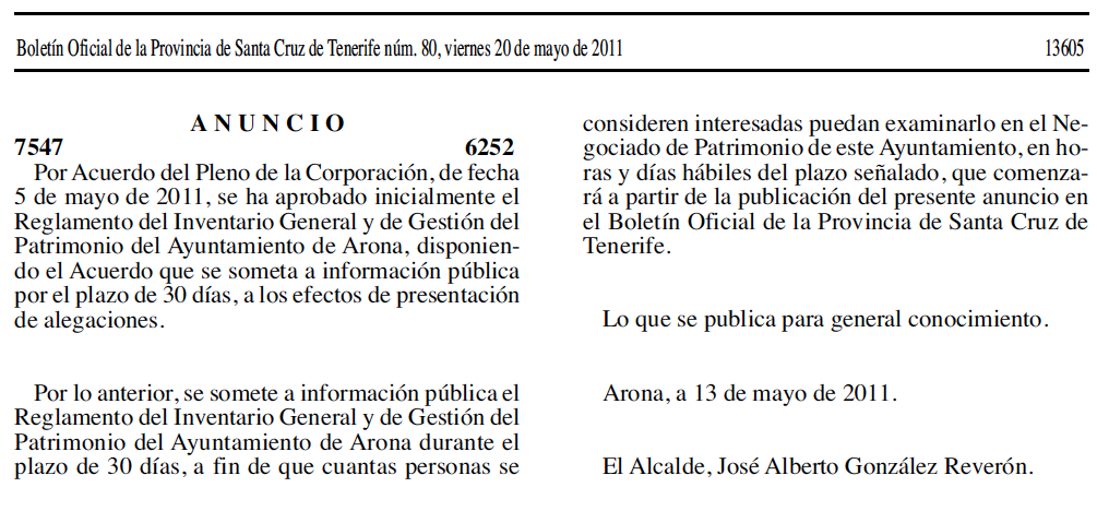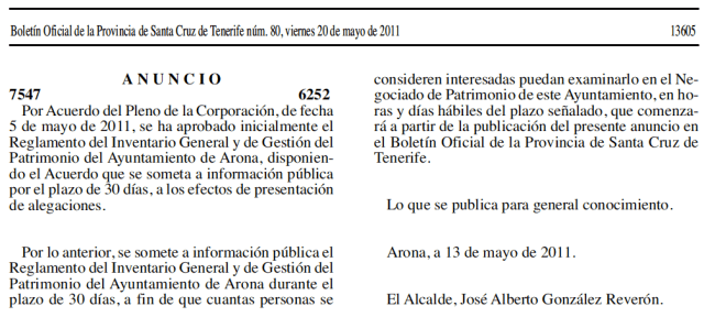 O sea, un nuevo embolado que compromete seriamente a los bienes públicos, a las arcas municipales y, cómo no, al interés de los aroneros. ¿Y por qué? Pues porque a ninguno de los responsables políticos de Arona se le ocurrió nunca formalizar en el Registro de Bienes la propiedad de ese inmueble (cedido en los tiempos en los que Mario Spreáfico fue alcalde, en el trozo de mandato que presidió entre 1995-1999). Y, sobre todo, porque el gobierno bertista se precipitó a gastar dinero municipal en algo que no cumplía todas las de la Ley (jeje, y, además, de forma también incompatible por la Ley. O sea, mejor digo «que no cumplía casi ninguna de las de la Ley»).