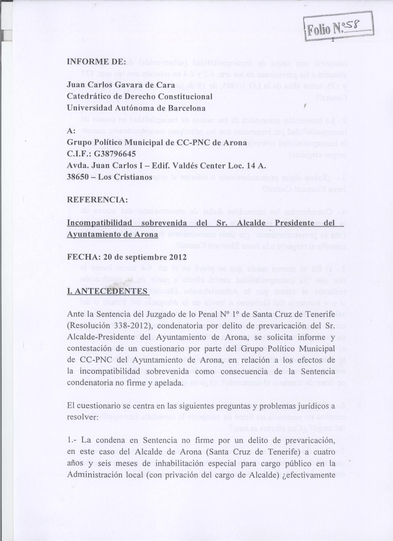 Uy, disculpen, pero con tanto jaleo surreabertista se me había pasado postearles al menos las conclusiones del escandaloso y famoso informe de encargo elaborado para CC por Juan Carlos Gavara de Cara, el catedrático de Derecho Constitucional de la Universidad Autónoma en quien el alcalde ilegal de Arona, su gobierno de CC y CAN-CCN y Coalición Canaria en peso han apoyado la berstialidad de votar en pleno que el Ayuntamiento de Arona no acate las instrucciones de la secretaria general ni de la Junta Electoral Central sobre la obligación de cese ex lege que determina la Ley Orgánica de Régimen Electoral para los condenados por delitos de corrupción como Berto.
