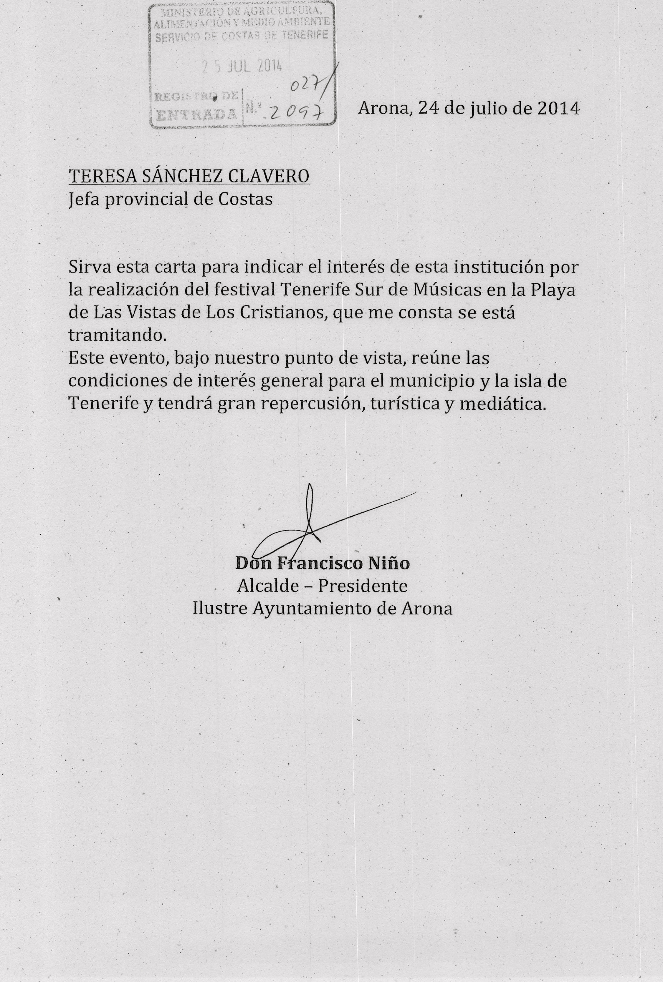Ah, pero tranquis los fervorosos defensores del evento, porque la productora en cuestión ha vuelto a pedir autorización para intentar celebrar su ‘ecologista’ macroconcierto playero el próximo año y, lo más importante: el alcalde Niño de Arona ya ha encontrado la solución para desbloquear el ‘pequeño’ escollo con la legalidad y con el medio ambiente que lo han hecho inviable hasta ahora: lograr que sea declarado de interés público para el municipio. Así que se ha puesto manos a la obra y ha enviado a la jefa provincial de Costas de Santa Cruz de Tenerife una solicitud de declaración de interés público que, sin duda, dejará sin palabras a los detractores del espectáculo que añora con reunir a miles de personas en la playa de Las Vistas (Los Cristianos).