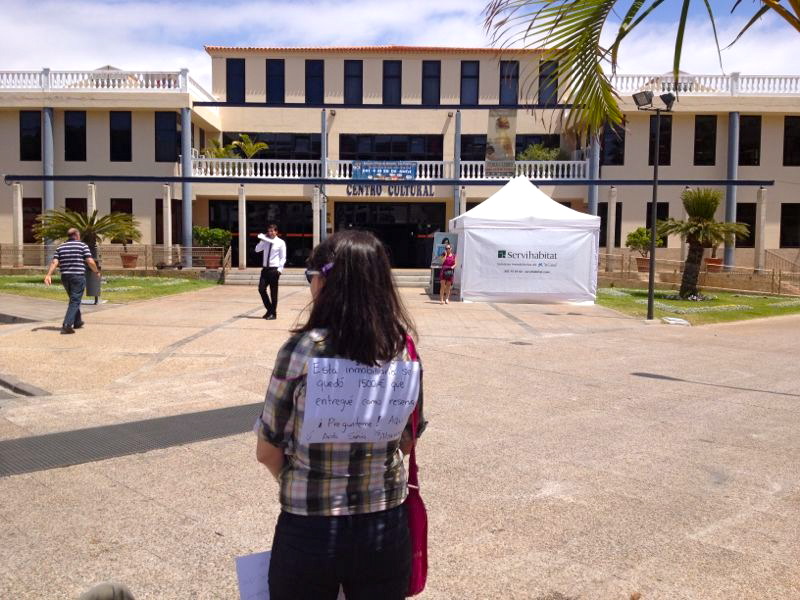 Una vecina indignada aja la campaña de ventas de Servihabitat en espacios públicos de Arona alertando de que esa inmobiliaria de CaixaBank no es de fiar.
