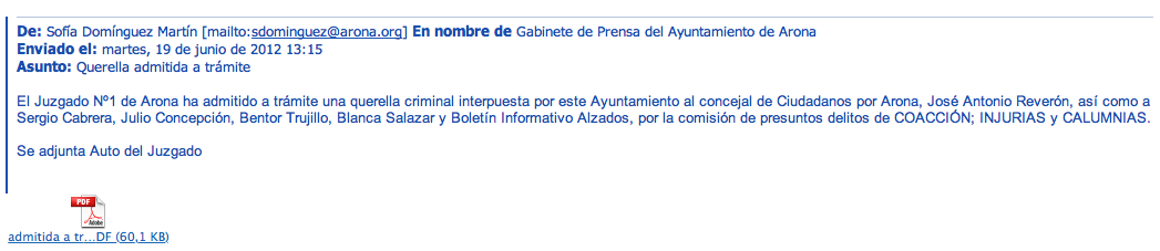 Ese es el auto que enviaron los querellantes en 2012 a través del gabinete de prensa del Ayuntamiento de Arona. Aquí les pongo el mail de prueba: