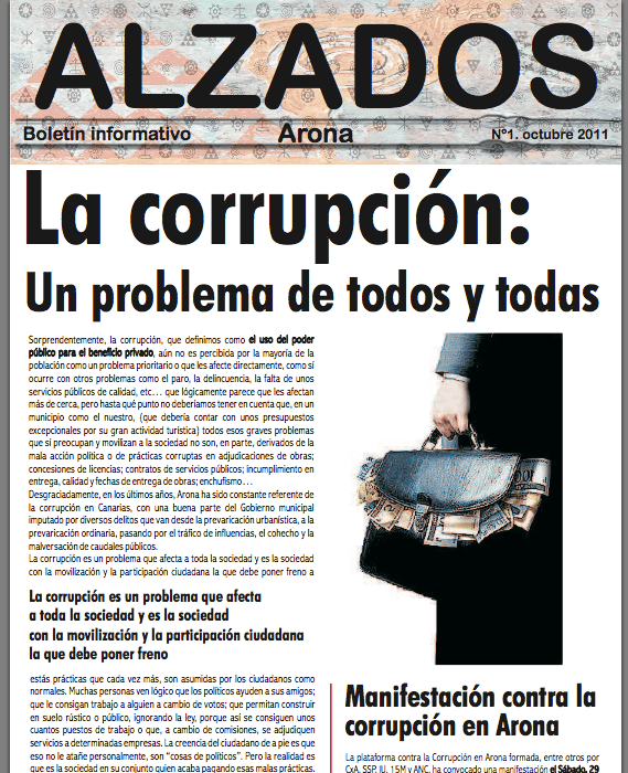 Aquí tienen el ‘famoso’ boletín que ha sembrado la discordia entre los ‘chiquitines’ nacionalistas de ANC y los ‘grandes’ nacionalistos de CC de Arona. Se llama Alzados, y joer, en los primeros días de reparto ya se ha cubierto de gloria haciendo honor a su nombre en su alzada contra la corrupción.