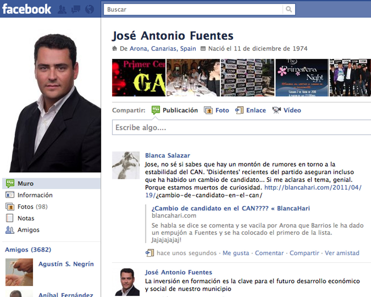El tono y la gravedad de los insultos que dos personas de otro partido profirieron en el Facebook de Fuentes fueron de tal calibre, que decidió borrarlos porque, como explicó él mismo en esa red social, «me parecían desagradables y muy hirientes, impropios y poco usuales en una página como la mía…». El candidato del CAn llegó a identificar con nombres y apellidos a los dos ‘atacantes’ (a quienes asegura haber denunciado ya ante Facebook). Uno de ellos, según él, es hijo de un gobernante aronero de Coalición Canaria.