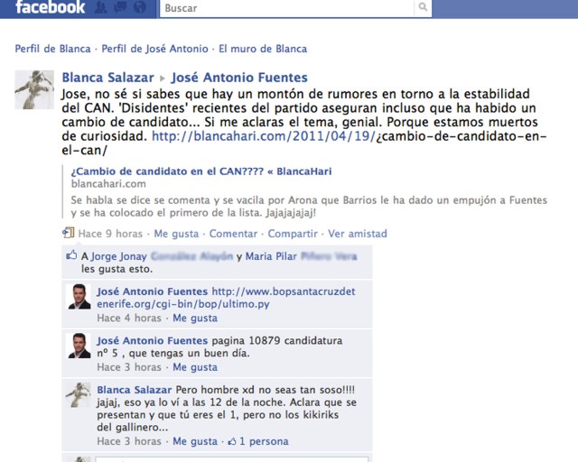 Por ciertooooooo, salvo el de Coalición Canaria (como era de esperar y como es lógico y comprensible), ¡ya se han hecho amigos feisbuqueros de BlancaHari todos los demás candidatos a la alcaldía de Arona!!! Todo un detallazo y una muestra de su buen encaje crítico y de su buen humor (aunque lleven la procesión por dentro 😉 ). Al fin y al cabo, en este blog los he llamado payasos -metafóricamente, jeje-, protagonistas de la versión político circense de ‘Agárralo como Puedas’ y seguro que alguna cosa más…