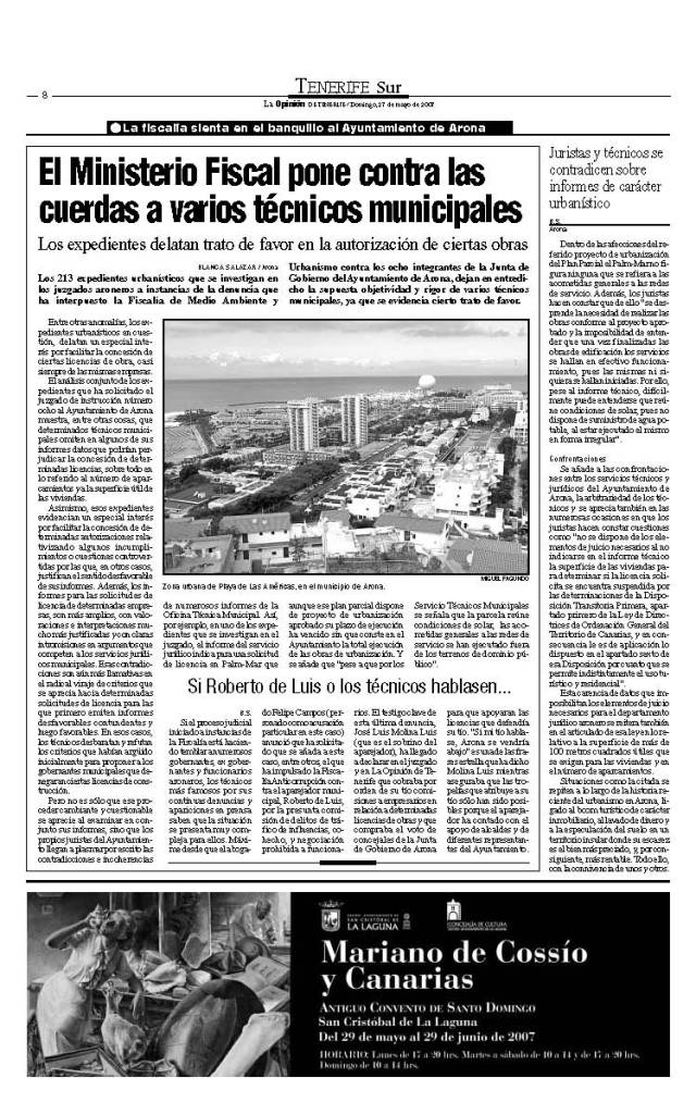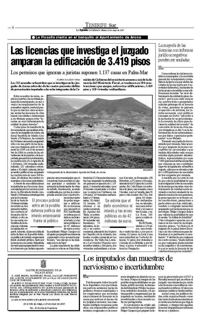 El abogado José Pérez Ventura (IU) ha ampliado la denuncia por presunta prevaricación que había presentado ante Fiscalía junto a Felipe Campos contra el ex alcalde de Arona, el ahora alcalde, Pacho Niño, 10 concejales más del gobierno aronero de CC y los dos del CAN-CCN. Supongo que recuerdan el escandoloso show surreabertista que esos denunciados escenificaron durante meses para evitar que el ex alcalde Berto acatara la ley orgánica que le obligaba a dejar el cargo desde que le cayó la primera condena de inhabilitación por un delito continuado de prevaricación en el Caso Enchufe. Jeje, lo del fiscal general del Estado y Gaspar Llamazares es difícil de olvidar…