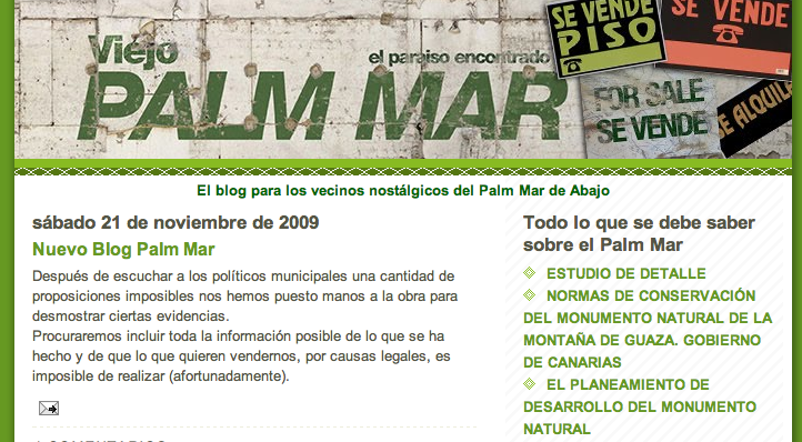El primero se llama ‘Viejo Palm Mar» ( http://www.palmmararona.com/ ) e ironiza en su cabecera con el lema «El paraíso encontrado». Una buena muestra de activismo ciudadano 2.0 que existe en este municipio. Vecin@-s anónim@-s que se rebelan contra las consecuencias del mal urbanismo y de la mala gestión pública que padecen en el lugar donde se supone que habían encontrado el paraíso. Jajajaj, lo mejor es que al intentar averiguar su autoría, me han contado que «igual es obra de la Brigada Verde del Palmar», jajajajajaj, xd, una Brigada Verde de activistas ciudadanos organizados y secretos! Si es que no se puede pedir más, jajajja, vaya municipio interesante y emocionante, jajajaja.