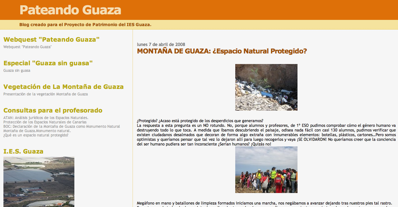 El segundo blog se titula «Pateando Guaza« ( http://www.patrimoniodeguaza.blogspot.com/) y se enmarca en un proyecto de patrimonio del instituto de Guaza. Lamentablemente, no tiene actividad desde abril de 2008. Pero así todo, creo que vale la pena echarle un vistazo. Buena oferta de contenidos, logrado enfoque ambientalista, destacable selección de enlaces sobre el Monumento Natural Montaña de Guaza, crítica constructiva, y hasta enlaces al periódico del IES… Que me ha gustado, vamos.