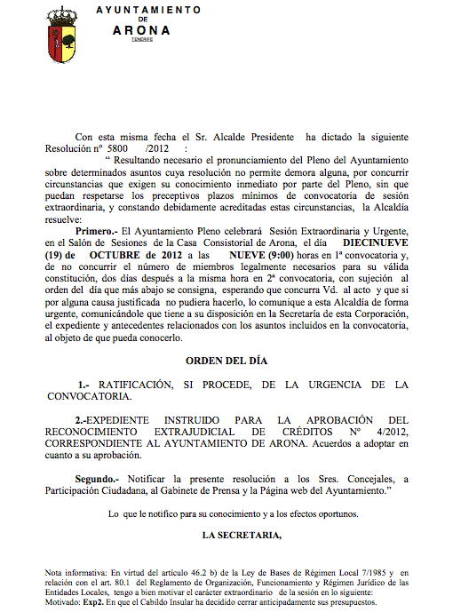 De nuevo el Alcalde Ilegal y sus ediles plurimputados vuelven a vulnerar el Reglamento Orgánico Municipal : convocando un pleno » fuera de lugar» ; convirtiendo lo Ordinario en Extraordinario ; y sobre todo evitando su Salida del Gobierno al cual se aferran «con Uñas y Dientes» ; en una » dantesca» interpretación de la No Renuncia Al Poder y a Las Prebendas . Mucho se juegan atrincherándose en el Consistorio y en el Pleno : Instituciones que hoy por hoy han renunciado al normal funcionamiento asambleario ciudadano y a la democracia : cualquier parecido con ésta es mera coincidencia. La protesta ciudadana y la participación popular quedan otra vez vilipendiadas por CC Arona que dispone del Ayuntamiento «cual solar en un cacicato».