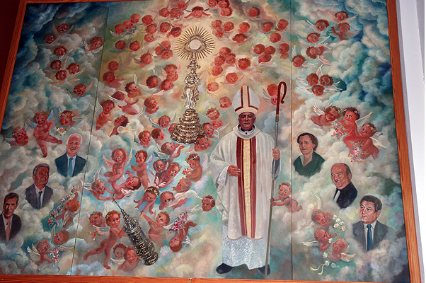 «La obra se titula Exaltación de la Eucaristía y fue encargada por el propio Melchior al pintor ¿hiperrealista? Miguel Rocha, que colgó el cuadrito en 2008, aunque debió tardar sus años en hacerlo, porque es de dimensiones considerables. Si verlo en fotografía provoca un fuerte impacto visual, imagínense lo que es verlo al natural 8O Uno de los haris de este blog hizo el peregrinaje hasta la iglesia y sigue en shock, así que lleven cuidado, por favor».
