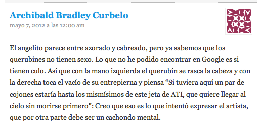 Como Belén de Vil y nuestro Charlie Hari son un lujazo, también aclararon mi duda de qué carajo hacía con el brazo el angelito que está debajo de Melchior -de verdad que visto en chiquitín me parecía que le hacía un corte de manga al celestial presidente insular de Tenerife-. Belén posteó la foto en detalle que le pasó nuestro agente y me dejó claro que ese querubín no hacía un corte de manga, aunque tenía cara de mala hostia -ella dijo «cara de mosqueo», pero vista la temática eclesiástica, reversiono su explicación. Pero miren, aunque no acertara con lo del corte de brazo, no iba desencaminado mi instinto espía sobre la actitud del ángel, jeje.