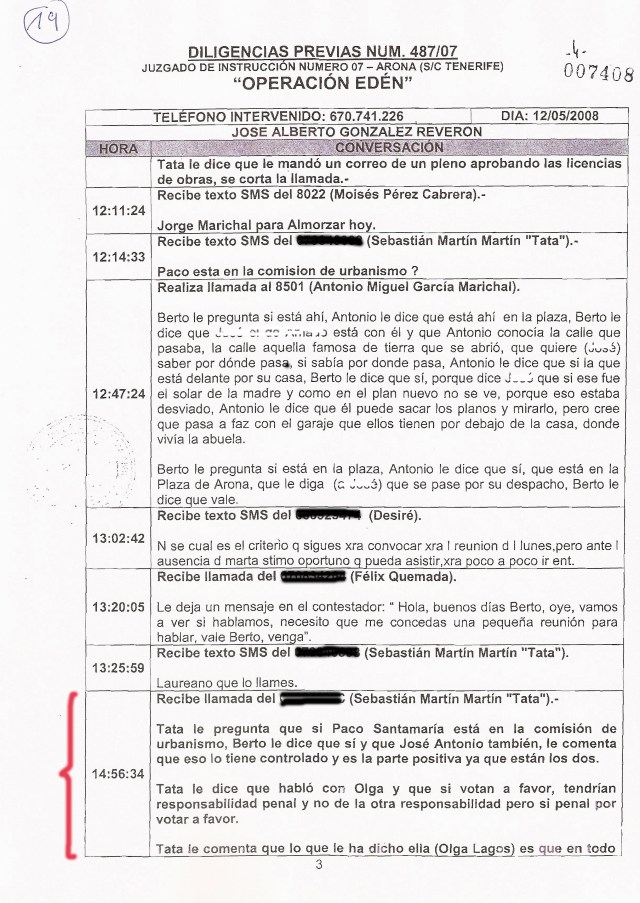Les adjunto una galería de seis páginas de las diligencias previas del Caso Arona relativas a conversaciones entre el alcalde, Berto, su concejal Antonio Sosa y el entonces ya ex concejal Sebastián Martín (como apunta la Guardia Civil en sus informes, seguía moviendo los hilos del gobierno aronero desde la sombra aunque, y esto lo digo yo, hacía creer a los empresarios y a la prensa que se llevaba fatal con el desquiciado Berto). En los siguientes documentos judiciales pueden ver cuál fue el plan que intentaron poner en práctica conchabados con ‘su’ abogada para «pillar» legalmente a los socialistas en ilegalidades urbanísticas (el ‘su’ lo pongo entre apóstrofes porque como es pagada con dinero público de la ciudadanía aronera…).